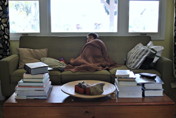 We moved the desk under the pictures. We like the way it looks, though it isn’t ideal for writing. I still can’t tell who might sneak up on me. And where the desk once was, so sits the armchair. I now have a lovely reading nook, one I took advantage of this week of roiling tummies. I read three books from my unread library. Three, which is also the number of times Nicholas tricked us into thinking he was better. Hardly a coincidence, I say.