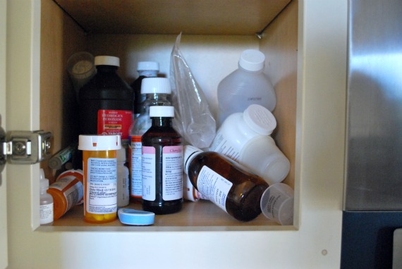 Most people use the medicine cabinet in the bathroom, but I grew up in a paranoid physician’s household. Instead of a box of band-aids and aspirin in a dark bathroom, we had an entire cabinet stocked with medicine, vitamins, rubbing alcohol, hydrogen peroxide, 4×4 gauze pads, bandages of all sizes, ointments, cold medication, emetics and anti-emetics, over-the-counter pain medication, heating pads, and rubber ice bags. We never did use more than 2% of the contents, but it was organized and waiting like an operating room.