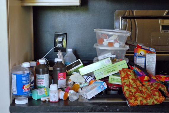 side note–I am so glad to hear I’m not the only one who stores medical supplies in the kitchen!