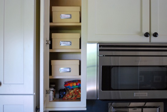 Now, whenever we need something, we pull down the entire box. This works especially well at 1:00am with a sick child. You grab the whole box and head back to their room for the long night ahead. No more back and forth getting supplies. I can’t tell you how many times this December I grabbed the cough medication only to come back to the kitchen an hour later for ibuprofin. Now all I have to worry about is tripping over a box in the middle of the night as I crawl back to my bed.