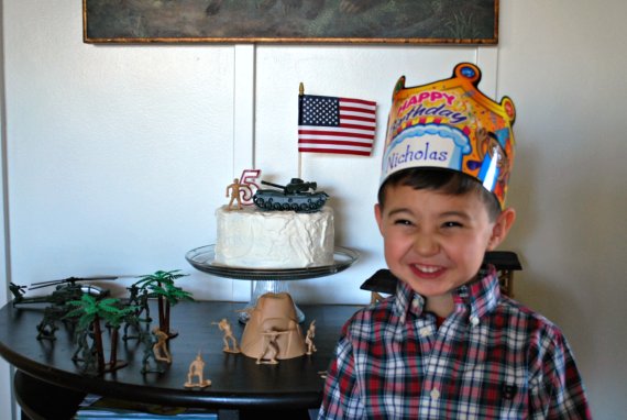 This is the first year he really understood and anticipated his birthday. He talked about having a party for months, and how he wanted to invite all twenty kids from his class for an Angry Birds/Transformers/Mario Brothers/Star Wars party with a two jumpers, a pi�ata, and a strawberry army cake with a green tank and one army guy on top.
