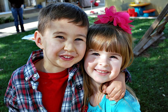We kept the guest list small. I don’t know all the kids from preschool, and I certainly don’t know the parents, so we limited it to the kids and parents I knew–the ones Nicholas talks about incessantly. Also invited, of course, was his cousin Addison (she’s the beauty on the slide and is later hugging Nico) and our neighbor’s daughter, Daphne. Play date material, in other words.
