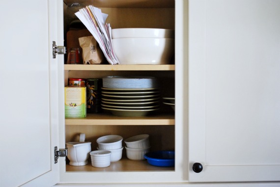 To the right of my stove, which is also diagonal to the slim cabinet, is a standard sized cabinet. Inside I store plates, bowls, platters, tea, my recipe box, and a loose collection of recipes I found online and in magazines.