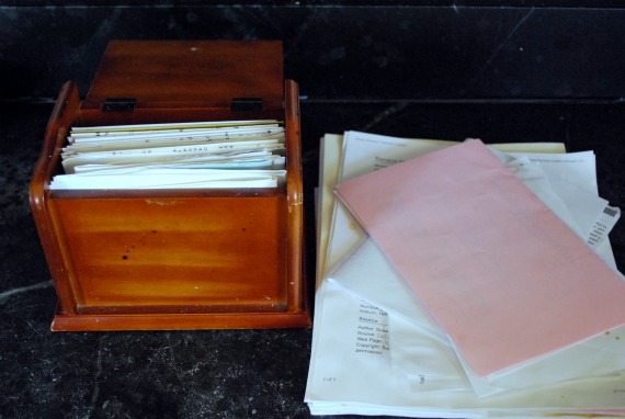 I then tackled my recipe box, which was equally pathetic. I kept only a handful of recipes, three from my grandmother that I didn’t even know I had. The rest went in the garbage. I will write out the recipes I cut from packages or ripped from papers on the recipe cards provided. They are huge, which I like. My writing is large and sprawling; I can use the room.