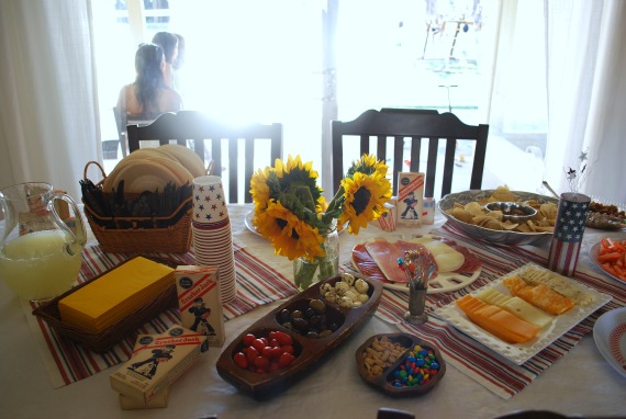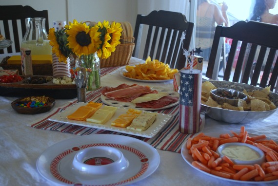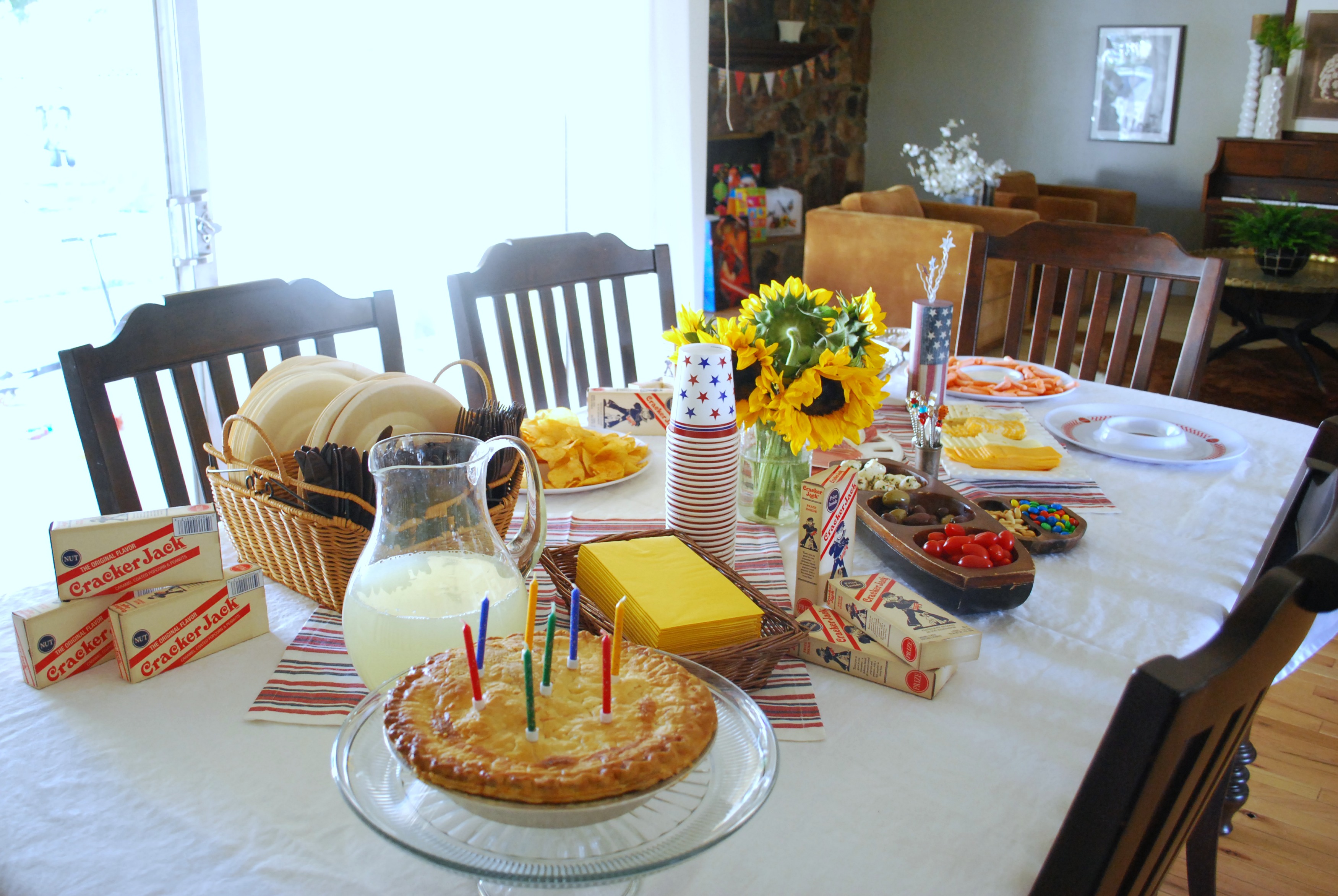 I really shouldn’t be allowed to host parties. As much as I spend in food, I’m tight fisted with the decorations and try to keep it to $20. (Not by choice.) I used all my regular linens and party plates and once again strung up my banners. I bought two red, white, and blue napkins at Cost Plus World Market and used them as a table runner. The flag firecracker is from a local party supply store and the vintage Cracker Jacks boxes are actually new and from Walmart. No one ate them because they looked like part of the decor! (Oops.) The blankets the kids used to eat on picnic-style are old 80s Santa Fe comforters belonging to me and my brothers.