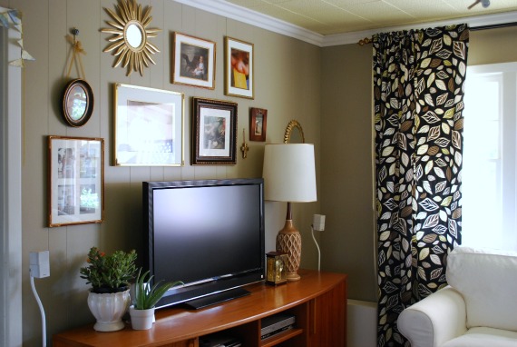 It looks great!! I love that you used gold frames. I like how you hid the Wii thing with potted plants. I’m totally stealing that idea!