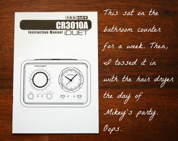 A couple of weeks ago I bought an ipod/iphone docking station. I took it out of the box and set it up in the bathroom so I can listen to music while I get ready. The box stayed on the floor for a couple of days until I was sure I wasn’t going to return the radio. (I’m calling it a radio.) The manual stayed on the counter because it stayed on the counter.