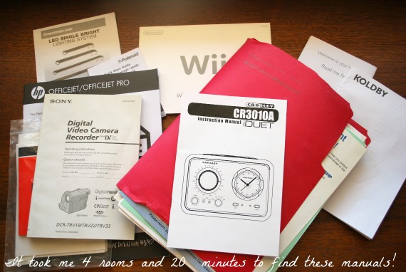 I was on pinterest the day after Mikey’s party and stumbled across an ingenious way to store manuals. I’m sure I’ve seen and read about this method countless times before, but I never remembered it until I pushed aside a radio instruction manual to reach my hair dryer. With a wayward manual and a desire for a quick project to squeeze in between adventures, I set about organizing my instruction manuals in a centralized location. But first, I had to gather up all the manuals.