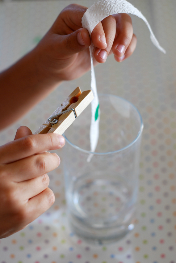 Pin your strip of paper towel to the interior of your glass, allowing the bottom inch of paper to hit the water. Keep the green dot clear of the water.