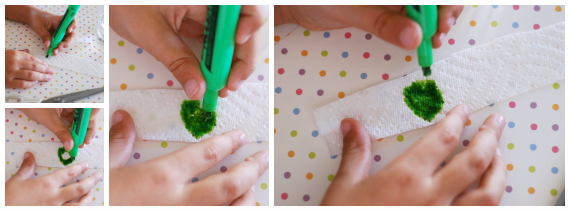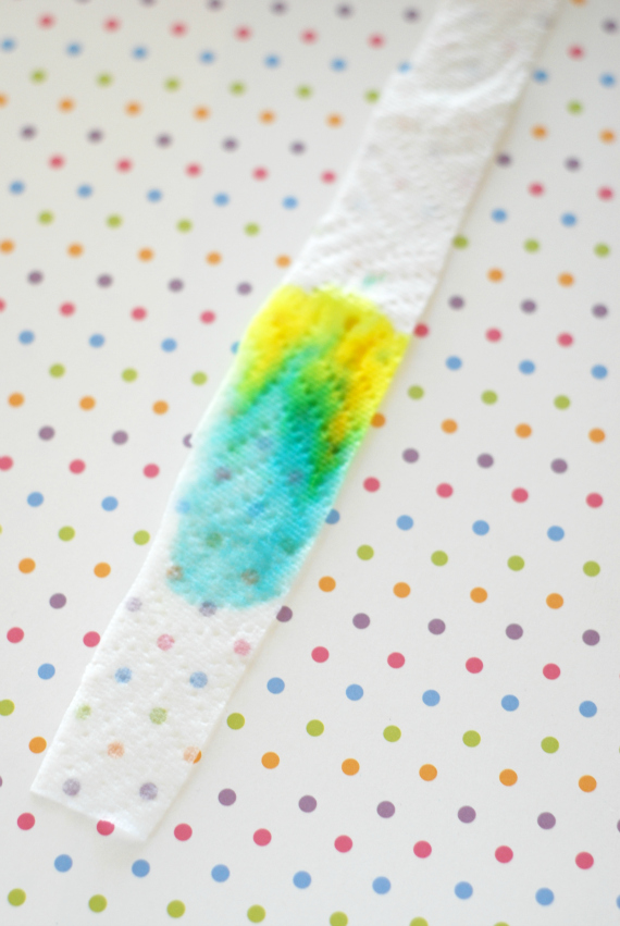 Cut a strip of paper towel, about 1 inch thick. About 2 inches from the bottom, make a large green dot with your felt-tip marker or apply 1 or 2 drops of green food coloring.