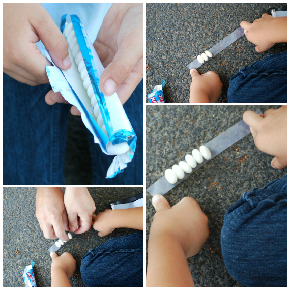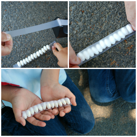 Next, unroll your pack of 12 Mentos and gently place a strip of scotch tape along the top. You can also lay the tape sticky side up on a hard surface and place the 12 Mentos individually. They will stand up!