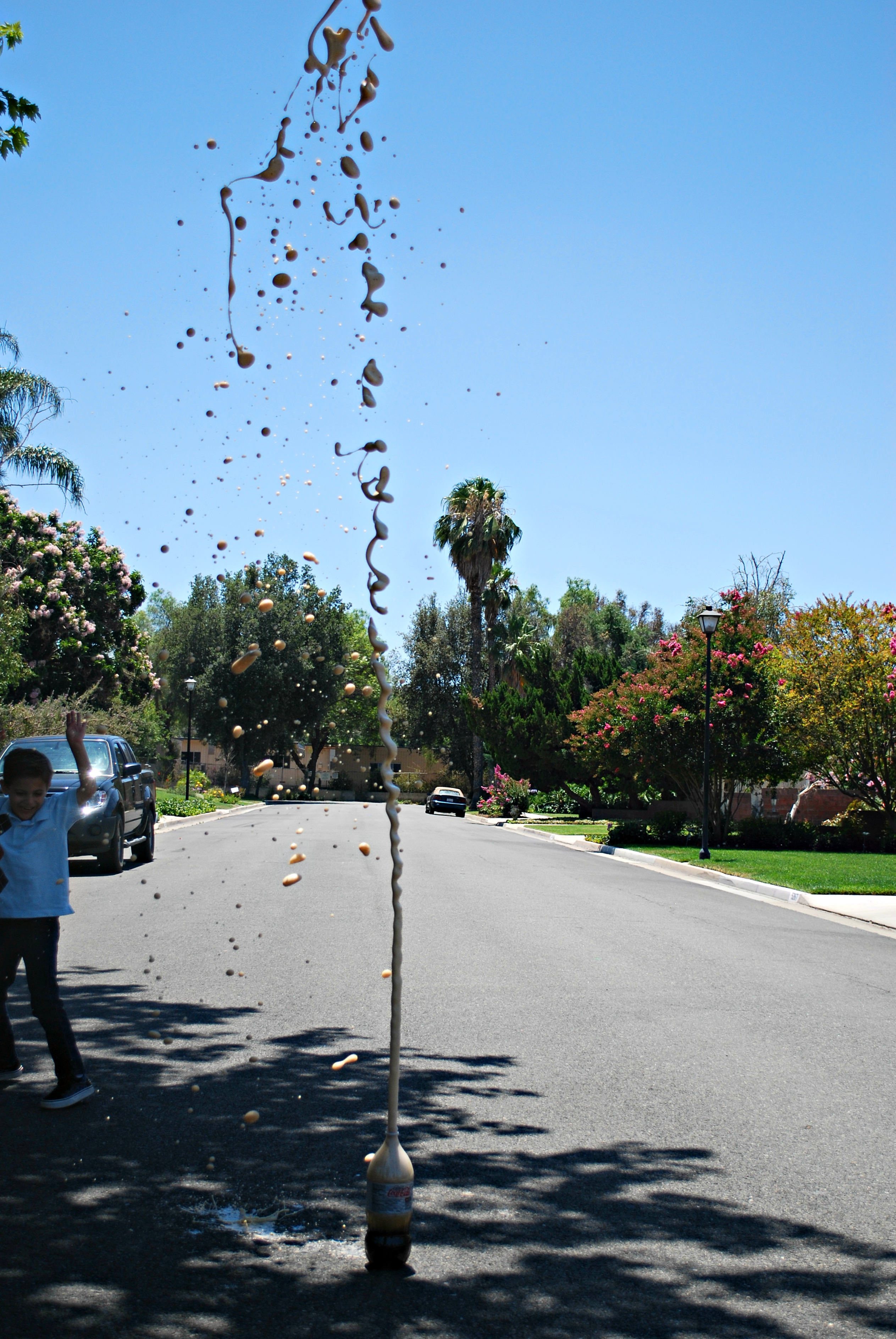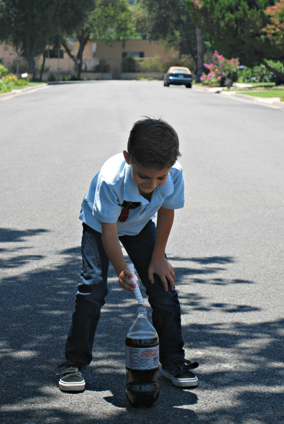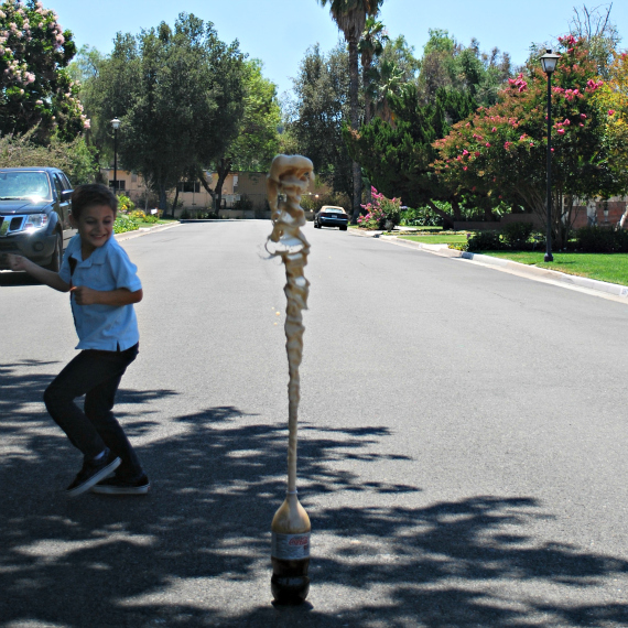 Shall we try that from another angle? Yes, lets. Thanks to the scotch tape, 5 year old Nicholas can be in charge of setting off the Cola Bomb.