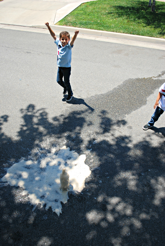 4th of July is on Wednesday, so you all have to do this with the kids and the adults. We set off these bombs in front of our neighbor’s tree. She laughed and laughed, partly because it’s fun to see something harmless explode on purpose, and partly because the joyous screaming and dancing by Mikey and Nicholas was infectious. “You guys just made my day,” she said as she walked inside, still laughing. I believe it. You just can’t be in a bad mood after watching soda shoot 15 feet into the air.