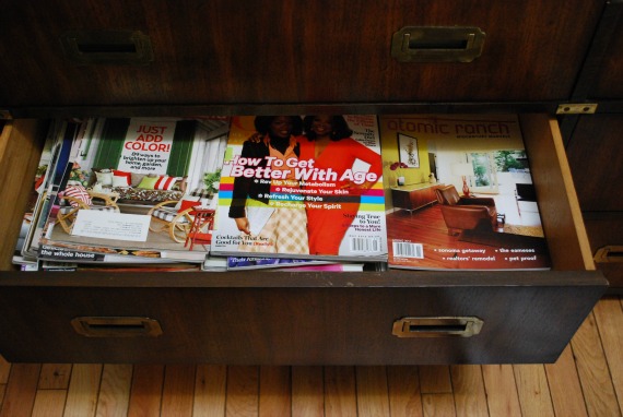 Then, because I didn’t have time to go through them and tear out the sheets I wanted to keep, I opened the drawer underneath and put them on top of even more magazines. I had planned to tackle both these drawers at once and do a major magazine purge/organization day, but it didn’t happen. That’s okay. Progress, not perfection.