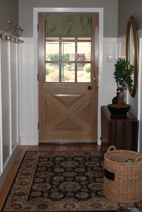 We ended up using the sport basket (Target) for shoes. The table is the same antique folding table that has moved from room to room for the last 8 years. The hooks are from Anthropologie. There are a few things I would like to change, but I’m still happy with the results. The roman shade isn’t my favorite, but I haven’t decided what I want in it’s place and I didn’t want to buy something new for a pretty picture. It stays until then. The rug is from Overstock, and I like it, but the pile is too thick. I can’t open the closet door easily or the front door at all without moving it all the way back. Normally I have it pulled back away from the door so we have an exit, but I pushed it into place for the pictures. (Yup, I admit it.) I’m on the hunt for something with a low pile and in my budget.