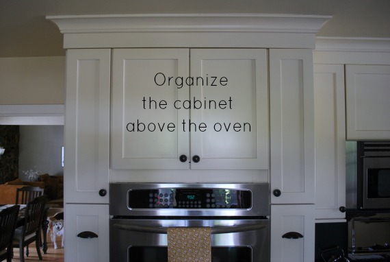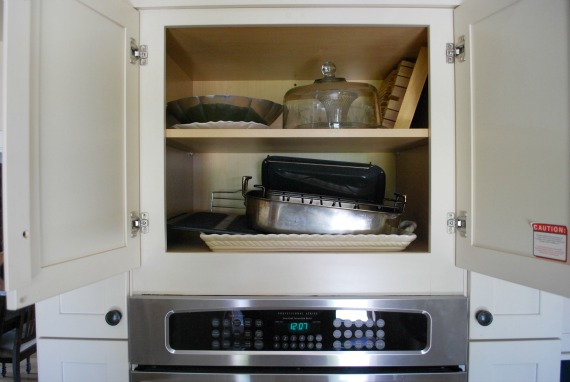 I’m still in the kitchen, bound and determined to complete one room–any room!–by the end of October. I never gave much thought to the cabinet above the oven. It worked, I knew what was in there, and I’m too short to see the mess. Working on the skinny cabinets that flank it inspired me to clean up the interior.