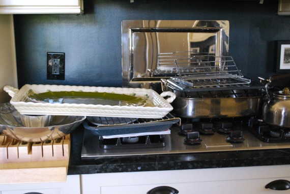 I pulled out a few platters (I knew where to put those!) a knife block I no longer need, a roasting pan, a broiler pan, a cake plate, a chip and dip plate, and some racks.