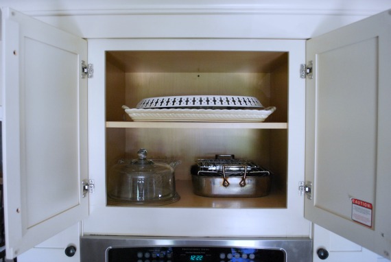I used the top shelf to hold large platters. This is much better than my previous arrangement, where I ran the risk of breaking them as I slid the roasting pan in and out. This project went fast, especially since I knew where to put what.