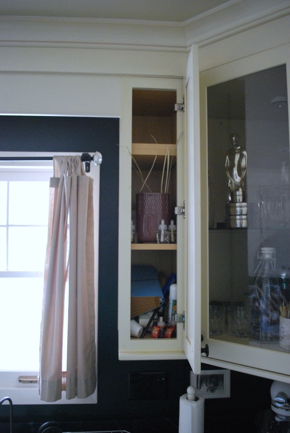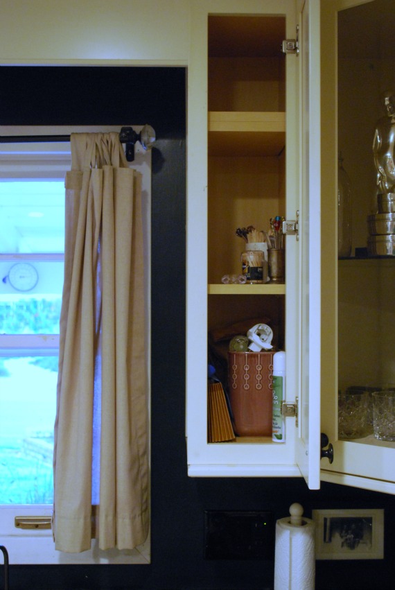 I have three skinny cabinets, though one is a spice rack. The other two are upper cabinets. One is above the coffee machine, and stores all the coffee and tea paraphernalia. The other holds our oft-used collection of ramekins and small pitchers. Its top shelf holds the fire extinguisher. We used to have it in the cabinet above the stove, but then realized that’s the last place you’d want to reach for it if something is flaming on the stovetop. I’m pretty happy with where things are in my kitchen, but these posts remind me that most of cabinets could be tidied up again. And why are my drawers all full of crumbs?