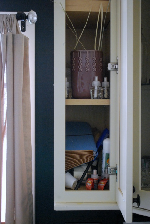 I never established the purpose of this cabinet, so for the last 7 years I’ve used it to store candles/matches/lighters, empty vases, air freshener, and a packet to keep receipts for taxes. (And palms from Palm Sunday? Oops.)