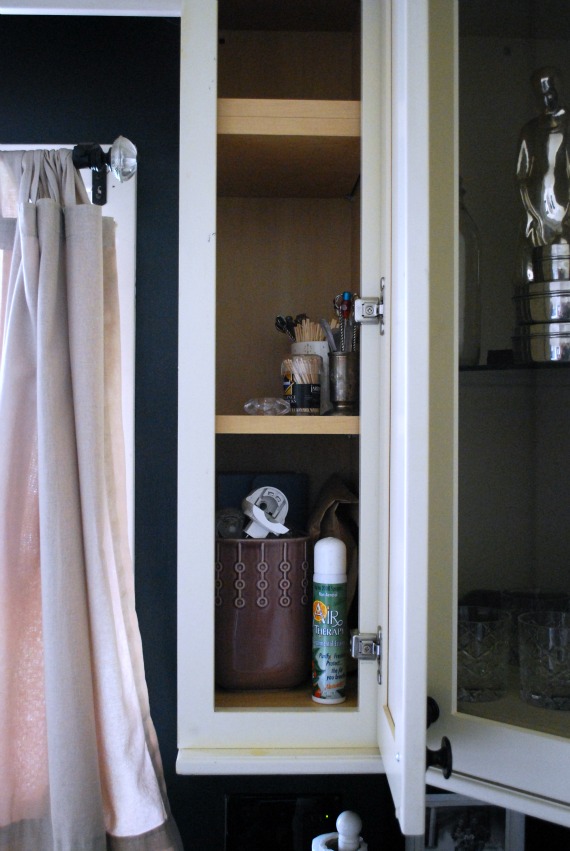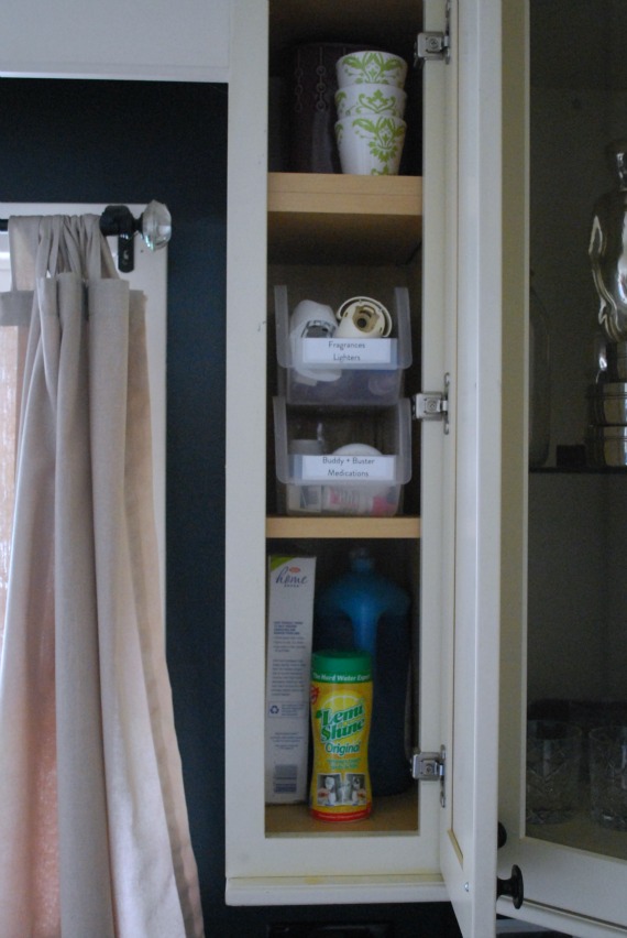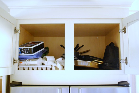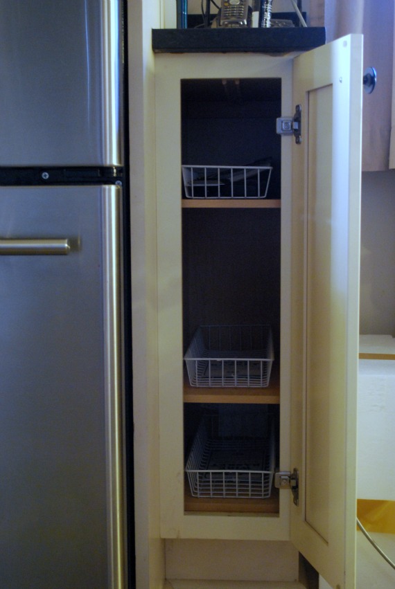 Not sure how many more skinny cabinets that you have, but one thing that my mom found useful with one of hers by the stove — store baking sheets and muffin tins on their side, so you can just slide them out. Of course, that would only work if you didn’t have multiple shelves in them, but for a tall and skinny cabinet, it’s perfect. You don’t have to worry about them all crashing around in the drawer under the stove (where we store them) and are super easy to pull out! Just a thought if you have a cabinet like that!