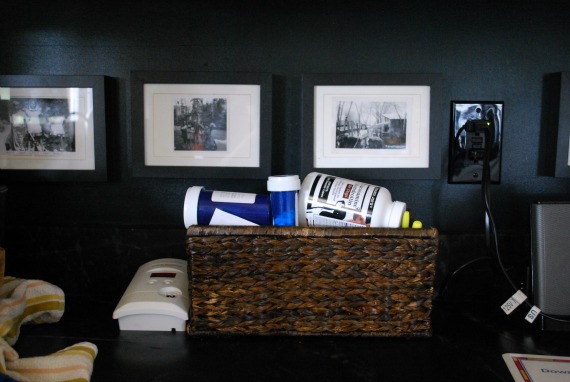 I rounded them up in a basket. The rest of what’s up there are refrigerator parts (wine caddy, egg caddy, extra shelf) that I need to keep for the day I sell the refrigerator. Oh, and a paella pan.