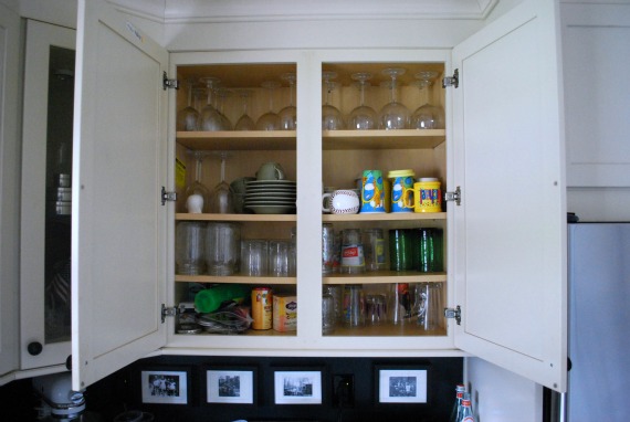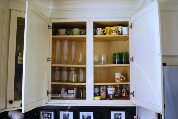 I hit the glassware cabinet next. I’ve been wanting to do this one for a long time. The first thing I did was to get rid of the wine glasses. We don’t need them, so I gave them to my mom for her to use during the holidays.
