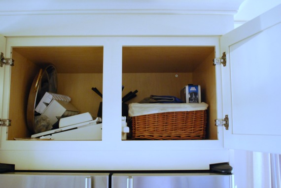 The cabinet above the refrigerator. Worthless. It stayed fairly organized since the last time I worked on it last October, but the lunch bags were flying around like bats.