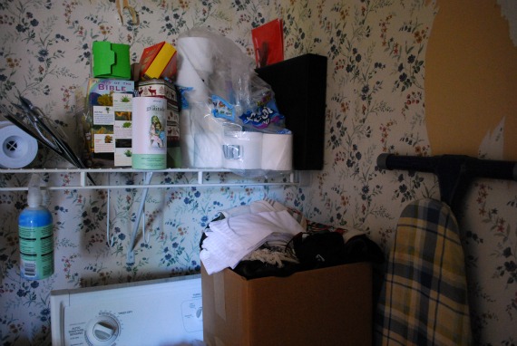 That’s not true. Instead of the shelf we had another thick rod the previous owners used to hang their laundry before and after ironing. They installed that rod in the late 70s. Before that, the back wall was a large window. We may one day bring back the window, but not any time soon. We’re sticking with practical, and practical means having shelves in the laundry room.The shelf was from our closet system in our first home. We needed a place to store our laundry soap and this is what we did on the fly thinking we would tackle the room as we remodeled the kitchen.
