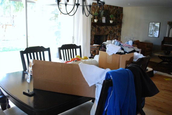 We pulled out the washer and dryer and put everything we kept in the laundry room on the kitchen counters and dining room table. While I went through the contents of the laundry room and got rid of what I could (a lot), my husband started scraping.