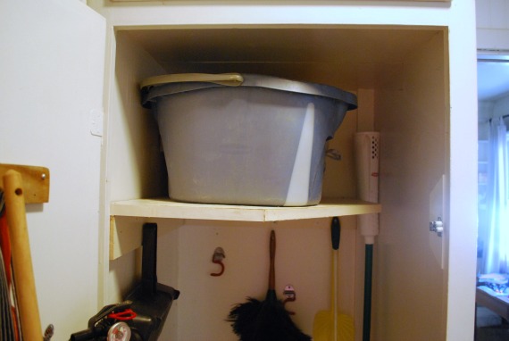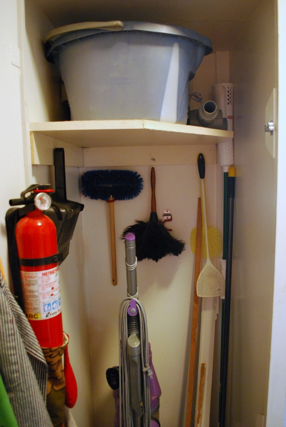 True to form, I just tossed in things I thought belonged in a broom closet. Brooms, for one. Cleaning supplies. The vacuum. Other stuff. I didn’t stress too much about it, and when I needed a shelf (the previous owners opposed shelves for some reason) I was content with my husband installing a leftover shelf from our kitchen remodel.
