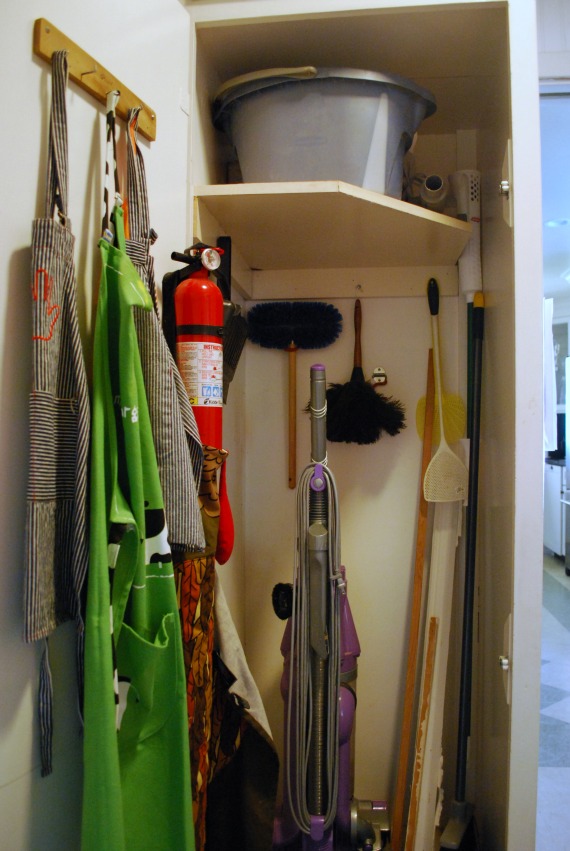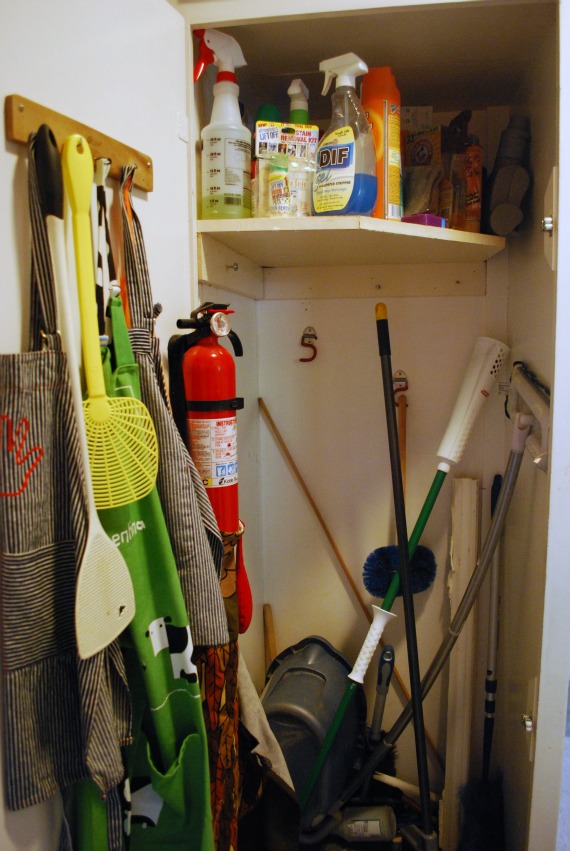My broom closet looks a lot like your before pictures. It was organized once, but it has deteriorated over time. The broom rack has fallen off the inside of the door (didn’t have the right anchors), the cleaning supply caddy is overflowing with empty bottles and things that don’t belong, and every time I open the door, I risk losing an eye from the falling debris. I’m going to go put “Clean out broom closet” on the next free space in my calendar. I’m having a hard time thanking you now (I’d rather go read Anna Karenina), but I’ll be grateful when it’s done. This stuff is so easy to overlook but it’s such an irritation when it’s out of order.