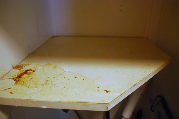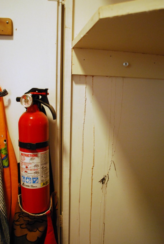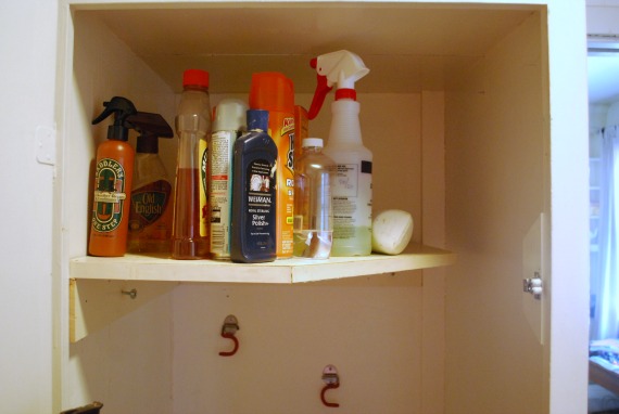 I use the broom closet regularly now, but not the supplies on the shelf. It’s too crazy up there, and I’m short enough to avoid making eye contact. The cleaning supplies I do use I keep under the sink because they’re easier to find. (Telling.) Last week as I was pulling out the vacuum I noticed a strange, solid drip along the side wall that almost looked like battery acid. I followed it up and discovered something up on the shelf leaked at some point. I couldn’t avoid cleaning this mess any longer.