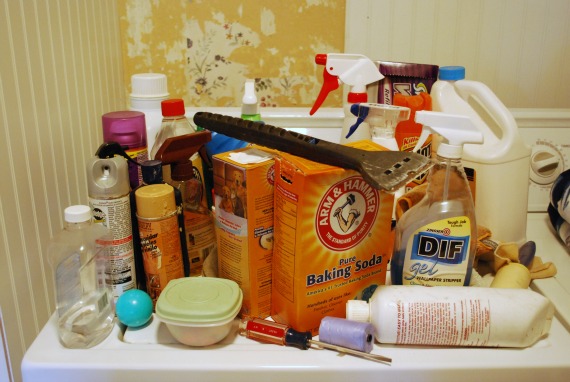 I took everything out and used the long handled blade to scrape off the dried chemicals from the wall and shelf. This worked really well. After that, I started tossing everything I didn’t need. That wallpaper remover was the first to go.