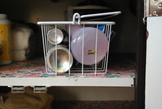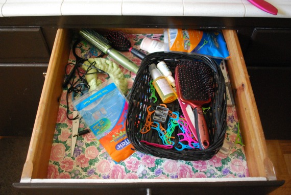 The vanity remains dirty most of the week. Toothbrushes tossed negligently to the side, toothpaste all over the sinks, hair products left where they were last used. Inside the top drawer, the little basket flies around the smooth contact paper and the boys (cough*Nicholas*cough) started using it to hide random curiosities like AV wires, rulers, and scissors.