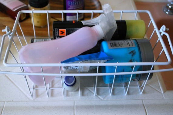 All the hair products usually left on the counter are now in a basket I found while cleaning out my strange bedroom cupboard. I placed it in the cabinet where it is easily accessible.