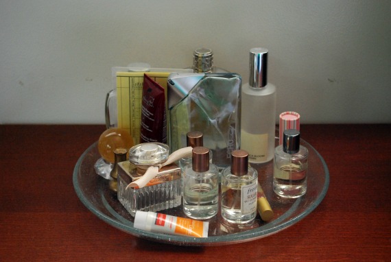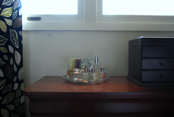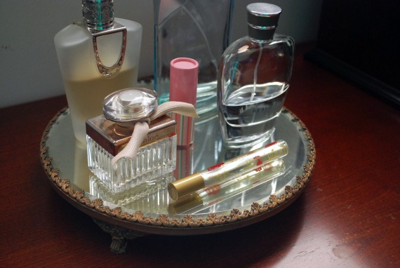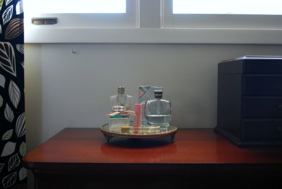 Love love the perfume stand. I just pulled out my floral ceramic plate I bought at a yard sale for putting on top of my dresser, and even if it looks like your before picture a little (SD memory cards + lipstick + floss + eyelash curler + perfume + everything else), it looks so much better than before.