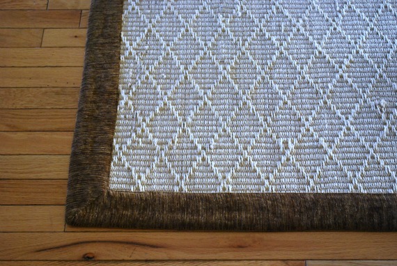 I didn’t love the chenille brown border, but I didn’t dislike it enough to pass up a good deal on something that serves our needs quite well. Years of scraping chairs left the floor under the table damaged beyond reasonably priced repair and dog hair bunnies were always gathering underneath. I needed a sturdy rug that could withstand indoor/outdoor traffic at a low price point. This works.