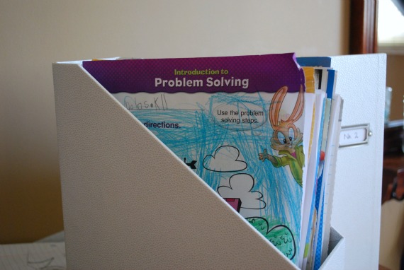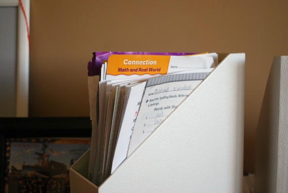 I could get away with one magazine file and empty it out at the end of each trimester, but I like to keep everything until the school issues final report cards. Then, at the end of the year, I throw it all away.