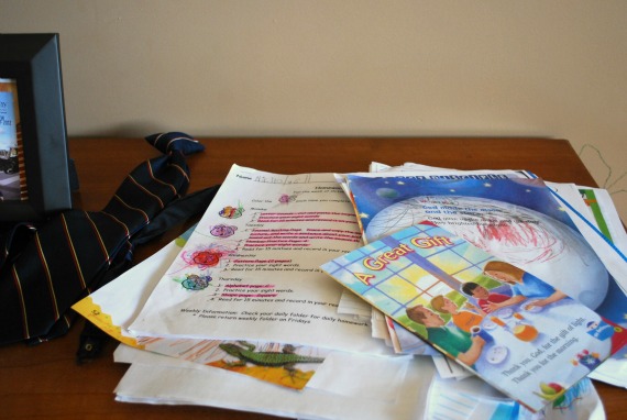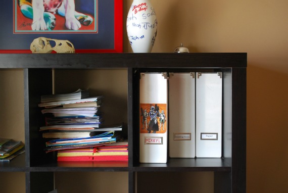 I found with Mikey that Kindergarten through 1st grade came with a truckload of schoolwork and homework to store in the form of worksheets, coloring pages, and little reading booklets. I saw a decrease in the paper by 2nd grade, and so far 3rd grade has been light, or at least reasonable. He brings home his graded homework and tests, but most of his schoolwork is now in workbooks that he leaves at school.