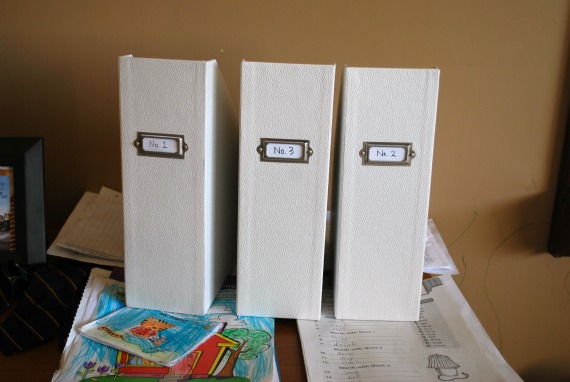 Because of the avalanche of paper I know is coming, I decided to buy 3 magazine files instead of the one I used for Mikey. The other files in the lead picture held coloring books and workbooks, and by the end of the year I had to scrunch the paper into the magazine file. Since their school uses a trimester system, I have a file for each trimester.