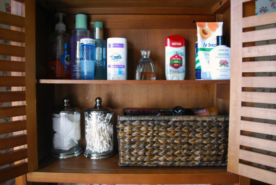 Waiting for perfect takes a long time. More than 7 years, that I know. Since perfect takes at least 7 years to arrive, I should have taken a day or two of the previous 2,555 to, I don’t know, organize our toiletries? Toss out beauty products that didn’t deliver. Grab a basket and corral those tiny items that will always look messy no matter how diligently you line them up.