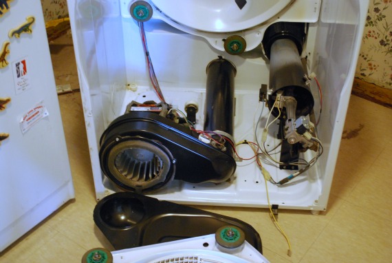 After this picture, he put the dryer back together again so he could diagnose the problem. It turned out we needed a new spark plug or something (zzzzzzzzz), so he took apart the dryer again, replaced the plug, and then put it all together again. I helped him put the drum back in the second time. I was instrumental to the project.