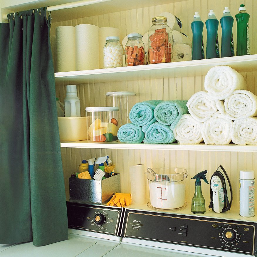This laundry room image from Martha Stewart was one of my first pins on Pinterest. I pinned it because it was simple, practical, and not too fussy. The rolled up towels are a bit twee, but I love that the cleaning and laundry supplies all in their original packaging versus the apothecary nonsense I usually see. My favorite part about the image is that it features an ordinary washer and dryer from the 90s. We happen to be the last household in America using a top loading washer (I checked. The other family bought a new set with their tax return in May.), so� I appreciate the inspiration. Thanks, Martha.