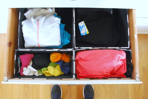I haven’t done a good job explaining how I organized my fitness drawer because the pictures make it pretty self explanatory. Storage bins: socks/pedometer/HR monitor; tops; bottoms; swimsuit/miscellaneous.